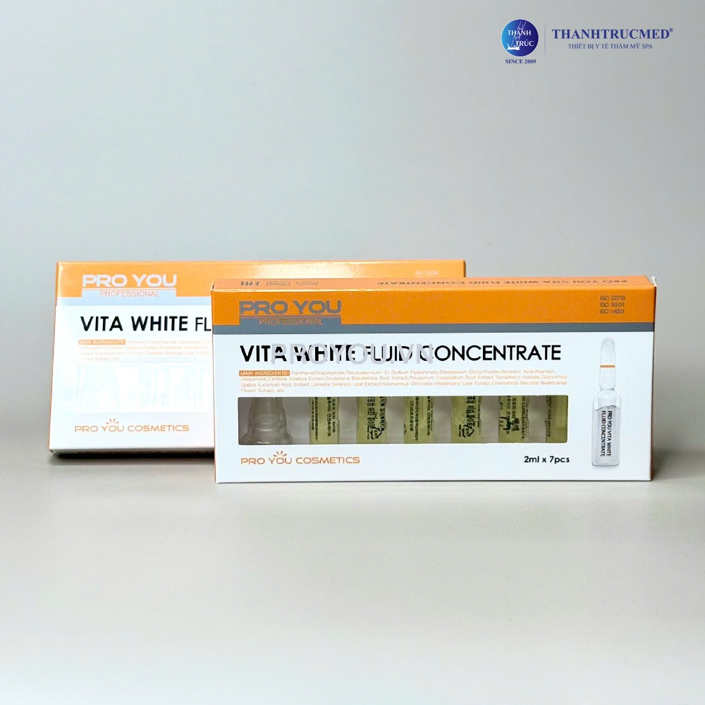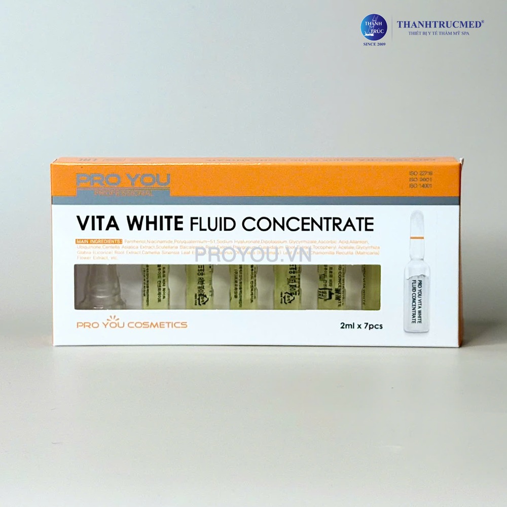PROYOU Vita White Fluid Concentrate là ampoule dưỡng sáng da chuyên sâu, kết hợp Niacinamide, Vitamin C, chiết xuất cam thảo (Licorice) và các dưỡng chất giữ ẩm như Hyaluronic Acid, Lipidure PMB, giúp nuôi dưỡng làn da đều màu, rạng rỡ và mềm mượt, đồng thời kiểm soát độ ẩm cho da khỏe đẹp.